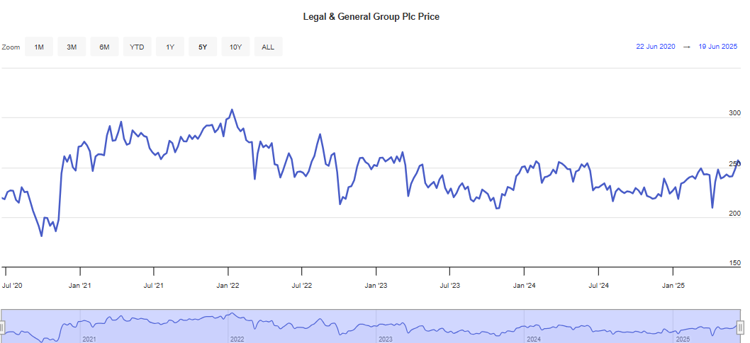 Legal & General (LSE: LGEN) is something I believe is worth taking into account. As I write this late on June 16, its share price has increased 9.4% to sit at 256p, marking a respectable if unimpressive start to 2025. With an annual dividend yield of 8.4%, it continues to rank among the top dividend shares of the FTSE 100 despite these gains.