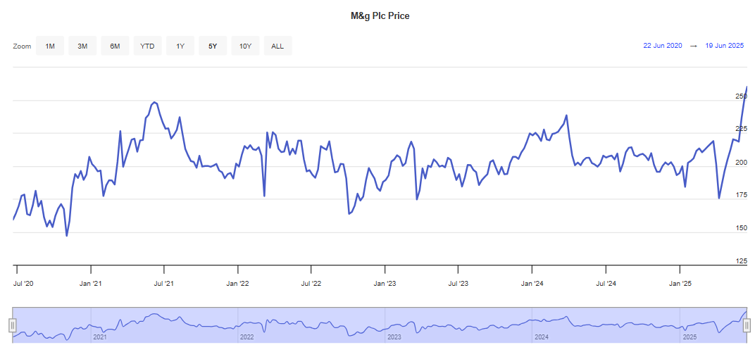 Similar to Legal & General, M&G’s stock is currently trading at 259p, just below a 52-week high. Nonetheless, management has reaffirmed its goal to maintain or increase the dividend, and operating profit increased by 5% in 2024.